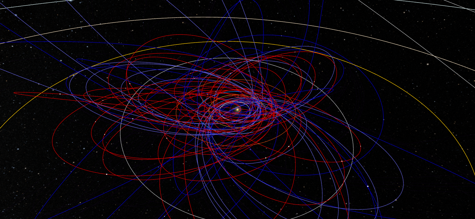 The orbits of the objects are computed from their physical orbital elements, along with their specific epoch, allowing their true locations to be shown at the correct time. The flow of time can be set to real time, sped up, or reversed, to better see the motion of the objects. The objects are selectable and display an information window when clicked, providing data such the object name, its orbital parameters, asteroid class, and more.